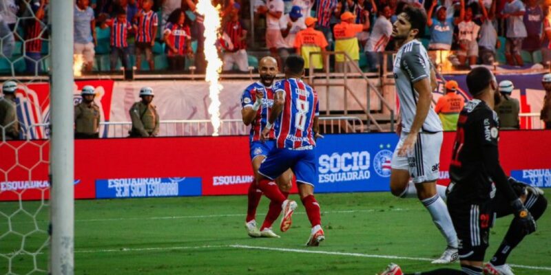 CompartilheCompartilhe 0 Nesta quarta-feira (6), o Bahia recebeu o Atlético Mineiro em busca de evitar o rebaixamento para a segunda divisão do Brasileirão . O Esquadrão fez uma das suas melhores partidas da temporada, venceu o Galo, se manteve na Série A, e ‘empurrou’ o Santos , que nunca havia sido rebaixado, para a Série B. O jogo terminou 4 a 1 para os donos da casa, com gols de Cauly, Thaciano, Ademir e Juba. Paulinho descontou para os visitantes. Bahia x Atlético-MG Nos 45 minutos iniciais, a partida foi recheada de emoções. Precisando ganhar para seguir na primeira divisão, o Bahia começou ‘a milhão’ e abriu o placar com Cauly, aos 11 minutos, após uma assistência de Thaciano, que surgiu de uma roubada de bola, em um contra-ataque fatal. Com isso, o Tricolor de Aço estava escapando do rebaixamento. Porém, Paulinho, artilheiro do campeonato brasileiro não deixou barato e fez mais uma vítima. Após um belo passe de Igor Gomes, o camisa 10 marcou para o Galo e empatou a partida, jogando ‘um balde água fria’ nos torcedores da Fonte Nova. No entanto, não demorou muito para a alegria voltar. Após mais uma assistência de Thaciano, Juba acertou um belo chute, que colocou o Bahia de volta na Série A do Brasileirão. O jogo foi em 2 a 1 para o intervalo. Segundo tempo No segundo tempo, as coisas continuaram dando certo para o Bahia, que fez um dos seus melhores jogos da temporada. Empurrados pela Arena Fonte Nova lotada, os comandados de Ceni demonstraram vontade de sobra e Thaciano, que havia dado duas assistências no primeiro tempo, marcou seu gol, sacramentando a permanência na Série A. Ademir ainda ‘fechou’ a conta nos minutos finais. O jogo terminou 4 a 1 para o Esquadrão de Aço. Permanência Após a vitória, o Bahia conseguiu confirmar a sua permanência na Série A do campeonato brasileiro em 2024. Nos momentos finais da competição, o Esquadrão deixou a zona de rebaixamento, e ‘empurrou’ o Santos, que perdeu para o Fortaleza e foi para a segunda divisão. ‘Emoções a flor da pele’ Durante os 90 minutos, o Bahia ‘entrou e saiu’ da segunda divisão algumas vezes. Após abrir o placar e escapar do rebaixamento, o Bahia voltou à zona de rebaixamento depois do gol de Paulinho. Nem mesmo depois de voltar à liderança (e também a primeira divisão), com Juba, e depois com Thaciano, o clima deixou de ser de tensão. Isso porque o Santos empatou o placar na Vila Belmiro, e com uma vitória do Peixe, o Esquadrão de Aço seria rebaixado.