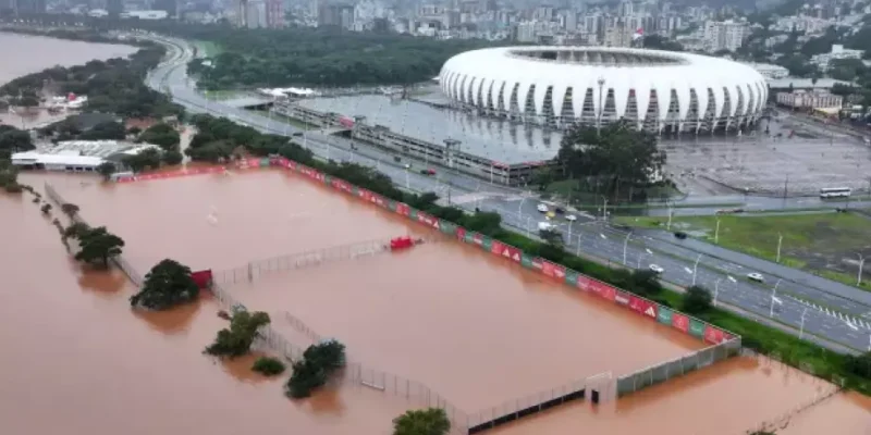 CompartilheCompartilhe 0 O Rio Guaíba atingiu, por volta das 21h dessa sexta-feira (3/5), o maior nível de sua história ao chegar a 4,77 metros. De acordo com informações da Defesa Civil municipal, a medição realizada no gasômetro ultrapassou a cheia histórica de 1941 — 4,76 metros. Às 4h deste sábado (4/5), o Guaíba estava próximo dos 5m — 4m96cm — ameaçando inundar ainda mais cidades como a capital Porto Alegre. Por conta da enchente, o Aeroporto Internacional Salgado Filho suspendeu os voos por tempo indeterminado. Os diques de proteção que ainda impedem um estrago maior na capital Porto Alegre podem romper a qualquer momento. Mortos e desaparecidos O número de mortes causadas pelas fortes chuvas que estão atingindo o Rio Grande do Sul desde segunda-feira (29/4) subiu para 39 no fim da tarde dessa sexta. Até o momento, são 68 desaparecidos e 23 mil desabrigados.